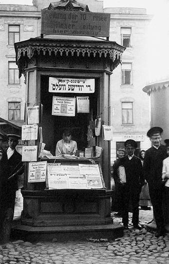 Газетный киоск в еврейском квартале Вильно, торгующий зарубежной прессой на идише. Начало XX века