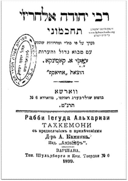 Титульный лист книги «Тахкемони» Йеуды Альхаризи с предисловием и примечаниями А. Камника. Варшава: Ахиасаф, 1899