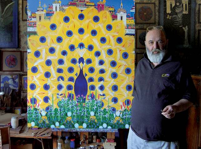 Александр Туманов на фоне своей работы «Павлин» (2010, частная коллекция, Италия). Москва. 2011 год