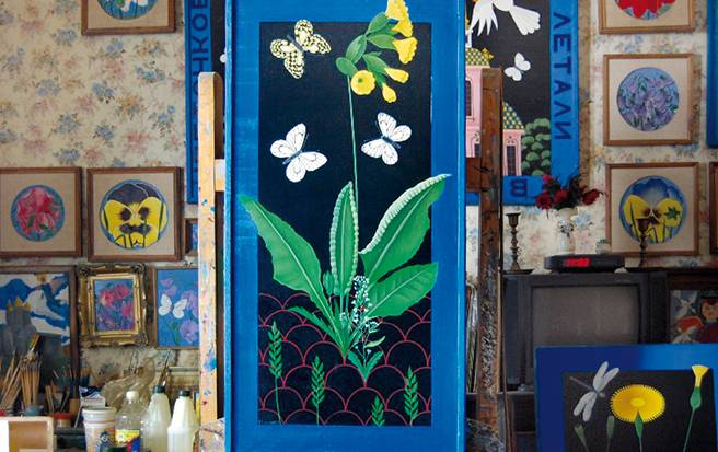 В мастерской художника. На переднем плане работа «Цветок с бабочками» (1989, частная коллекция, Израиль)