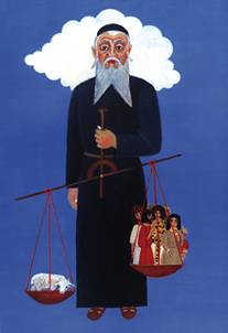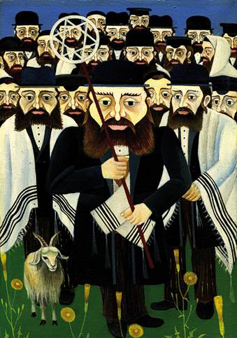 Мужик в картузе и жилетке на косоворотку — и торгует. Мне раньше не видно было в этом ничего кроме русской старины, может, немного анилиновой, но зато очень цельной, веселой и жизненной, не то что у передвижников… А тут стала писать о нем, разговорилась с женой Ирой (Нехамой) Тумановой о Сашиных родственниках, и поразил меня не тот из них, кто был великим защитником прав евреев (Барит), а другой, купец первой гильдии. Тут я и подумала: картуз-жилет-торговля, а над головой кресты, кресты. Золотые желтой краской: русским — старина, провославным — красота, а евреям — орудие казни да символ загнавшей их в черту оседлости империи.