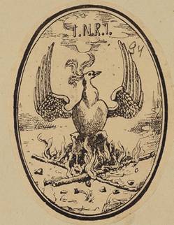 Один из экслибрисов коллекции Гинцбурга с изображением птицы Феникс (?) и буквами I.N.R.I. – «Огнем обновляется вся природа» (?)
