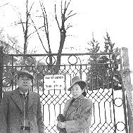 Супруги Сугихара у входа в парк, на воротах которого написано “Евреям вход запрещен”.