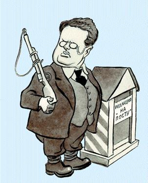 Возможно, Борис Михайлович действительно был не слишком внимательным сыном, но братом он показал себя достаточно заботливым. Ленин знал Волина, о чем между прочим, свидетельствует известная фотография, на которой они стоят рядом вместе со Свердловым. По ходатайству брата его сестра устроилась на работу в секретариат Совнаркома одним из технических секретарей, и неоднократно ей доводилось печатать на машинке под диктовку Владимира Ильича. Сам Волин в это время был направлен на Украину, где занимал преимущественно руководящие посты, был председателем губисполкомов в нескольких городах. Вернувшись в Москву в 1921 году, он занялся партийно-публицистической деятельностью, в частности редактировал столичную газету «Рабочая Москва», журнал «На посту». Это дало мне повод изобразить его в дружеском шарже в виде часового, стоящего «на посту» с игрушечным ружьем на плече. Шарж не только позабавил, но и несколько озадачил Волина: